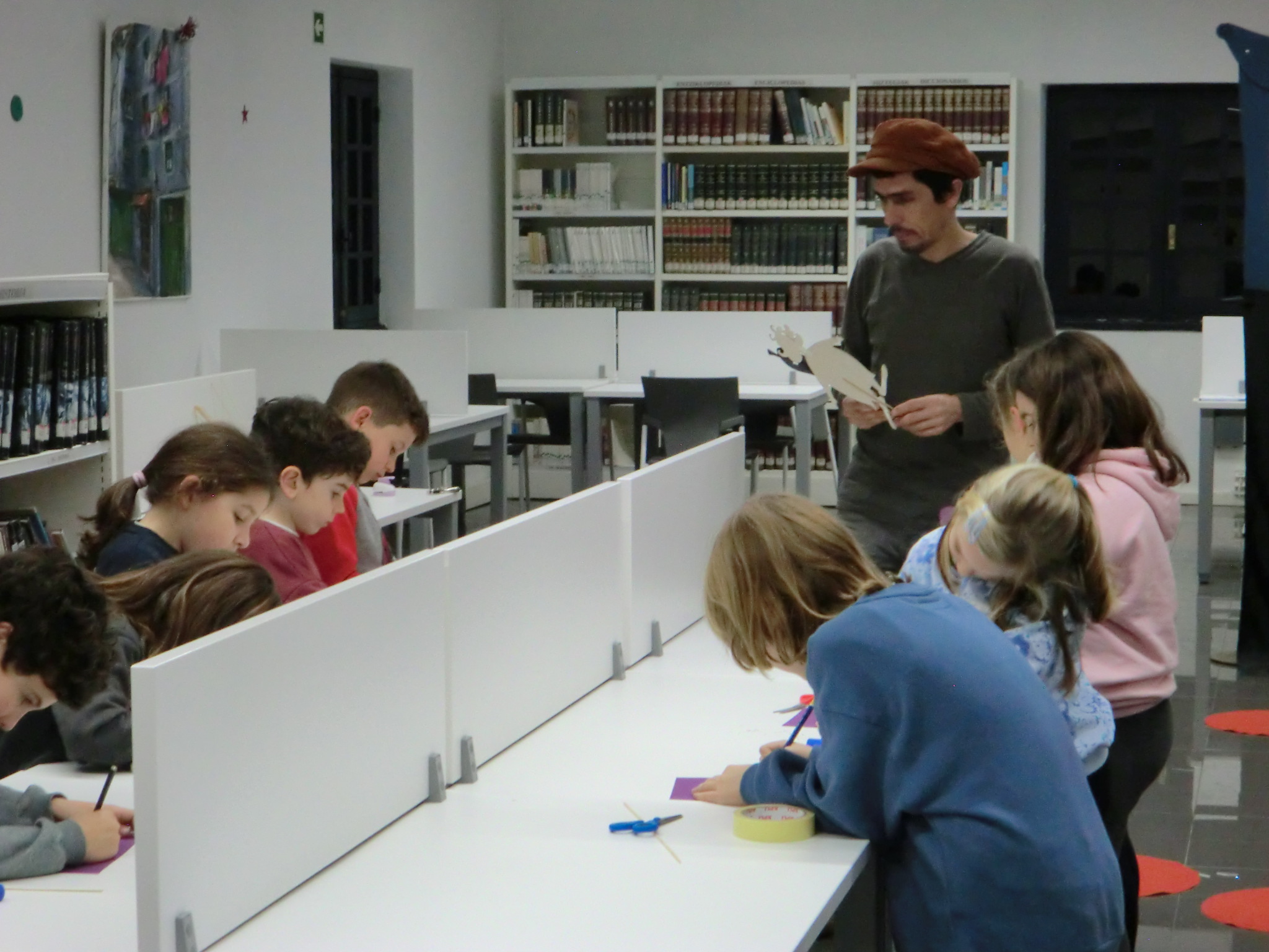 Hori hala, tailerrean trebatu zuten haurrek. Aurrena, eskulanetan murgildu ziren parte hartzaileak; material errazak eta erabilgarriak erabilita, itxura desberdinetako elementuak sortu zituzten haurrek. Irudiak sortu eta moztu ondoren, oihalaren atzean inprobisatzeko eta esperimentatzeko aukera izan zuten.