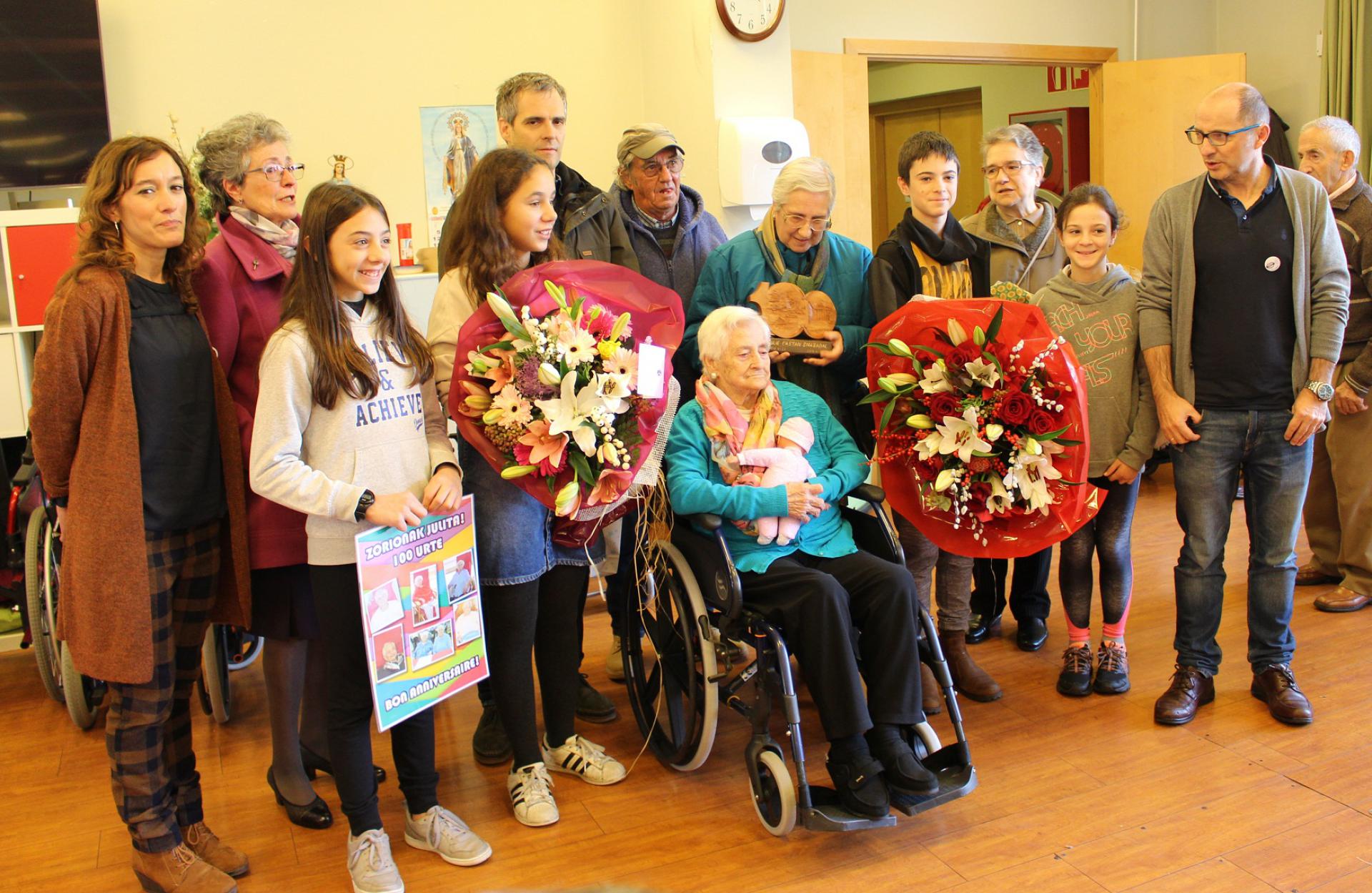 Gaur, azaroak 27, ospakizun eguna dute San Martin egoitzan; izan ere, bertako Julie Castam (Ziburu, 1918) egoiliarrak 100 urte bete ditu. Bizitzak ekarri zuen Castam Azpeitira, Ziburukoa (Lapurdi) baita sortzez. Gerratik ihesi joan zen Rufino Aizpuru azpeitiarra Ipar Euskal Herrira, eta han ezagutu zuten elkar Castamen eta biek. Familia osatuta, duela 60 bat urte etorri zen bikotea Azpeitira bizitzera, eta ordutik bizi da Castam herrian. Urtemuga borobila ospatzeko, familiako kideen bisita ez ezik, udal ordezkariena ere jaso du gaur goizean Castamek; hain zuzen ere, bera zoriontzen egoitzan izan dira Eneko Etxeberria alkatea eta Estitxu Elduaien Gizarte Zerbitzuetako batzordeburua. Mikel Sanjuan tailugileak egindako lana oparitu diote egoiliarrari.