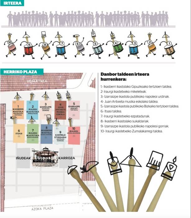 - 09:30. Ardozaleak eta Gure Ametsa danborradako taldeen, Udal Musika Bandaren eta Juan Antxieta musika eskolako txilibiteroen kalejira.
