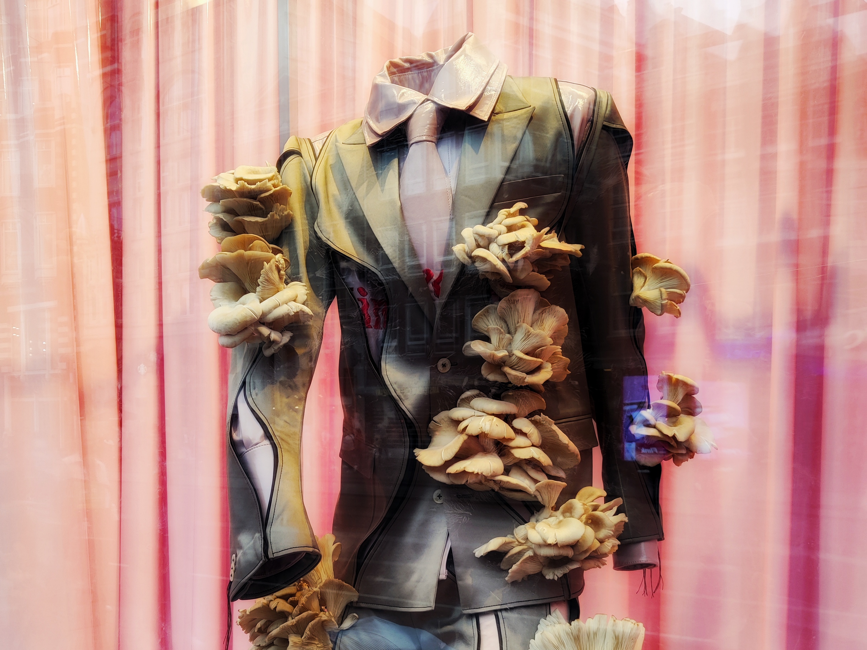 Bada, halako batean, duela zenbait urte Amsterdamera egin genuen bidaiako argazkietako batekin egin dut topo. Plaza batera daraman kaleetako bateko dendetako bateko erakusleihoetako bateko traje bat ageri da. Traje xelebre horietako bat, egia esan. Noraezean dabiltzan ebakiek azpiko alkandora uzten dute agerian, eta onddo batzuk ere badarizkie. Kotoia eta esporak bat eginda; hariek eusten diete jantziari, eta mizelioak onddoei. Hau idatzi heinean jakin dut Ninamounah diseinatzailearen jantzi batetik abiatuta egin zutela eskultura hori, onddoen tasunak "bizitzeko modu gisa" aztertzeko; maniki hezeak pixkanaka eraldarazi omen zuen artelana, horixe bera behar baitute onddoek, hezetasuna. Ezin egiaztatu hala izan zenik, hiriaren erdigunetik pasaeran geundenean behin besterik ez bainuen ikusi. Noiz arte iraungo ote zuten.
