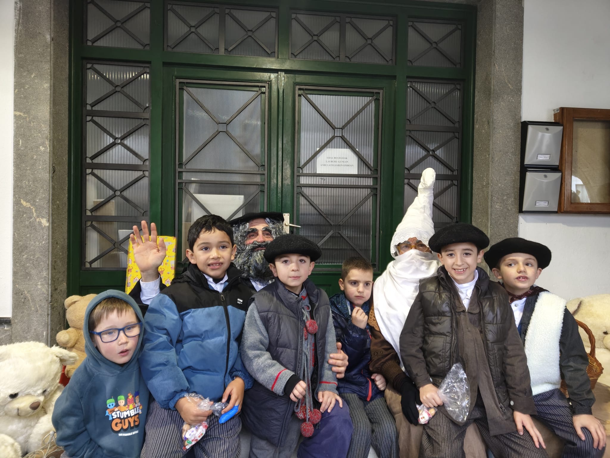 Goizean goizetik Gabon giroa nagusitu da Azkoitian. Euriak ez du itzali kantuan egiteko gogoa, eta hainbat lagun talde, haurrek eta nerabeek osatutakoak batez ere, Gabon eskean aritu dira. Poliki-poliki, elizaren arkupeetan hainbat familiek osatu duten ilara luzatzen joan da, eta trikiti doinuen atzetik iritsi dira, eguerdian, Olentzero eta Mari Domingi. Ikazkinek herriko haurren gutunak jaso dituzte, eta trukean, gozokiz bete dituzte haien patrikak.