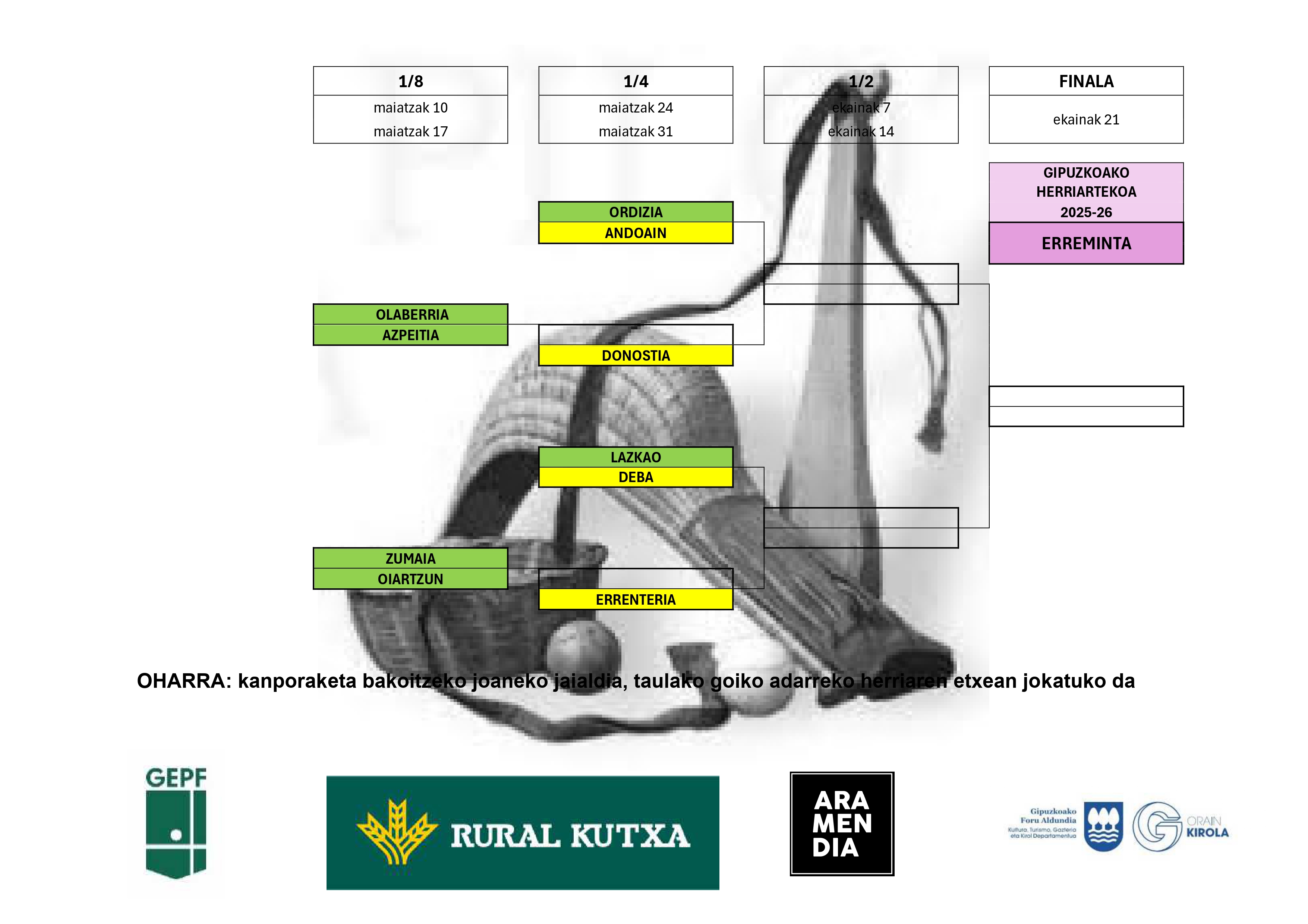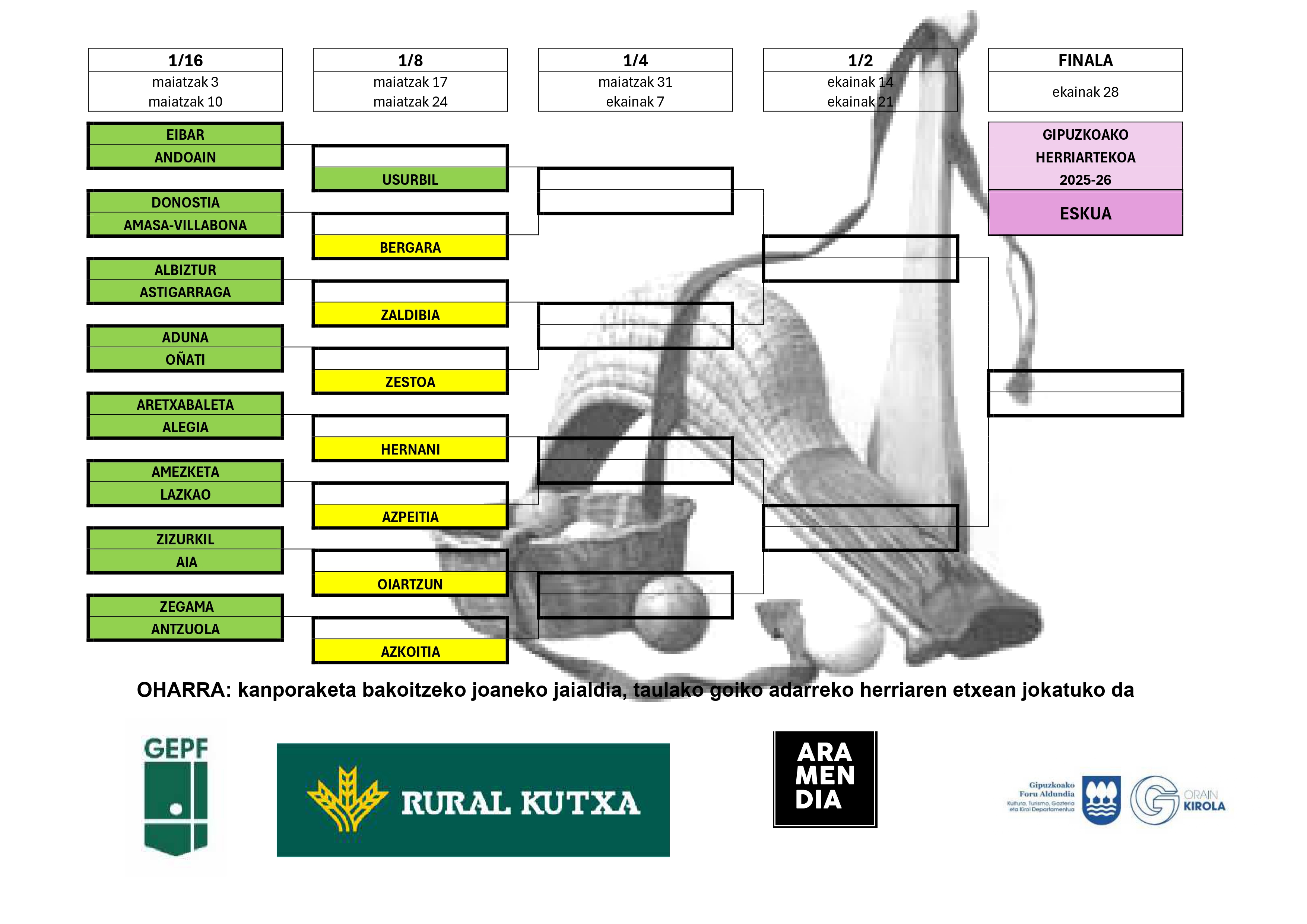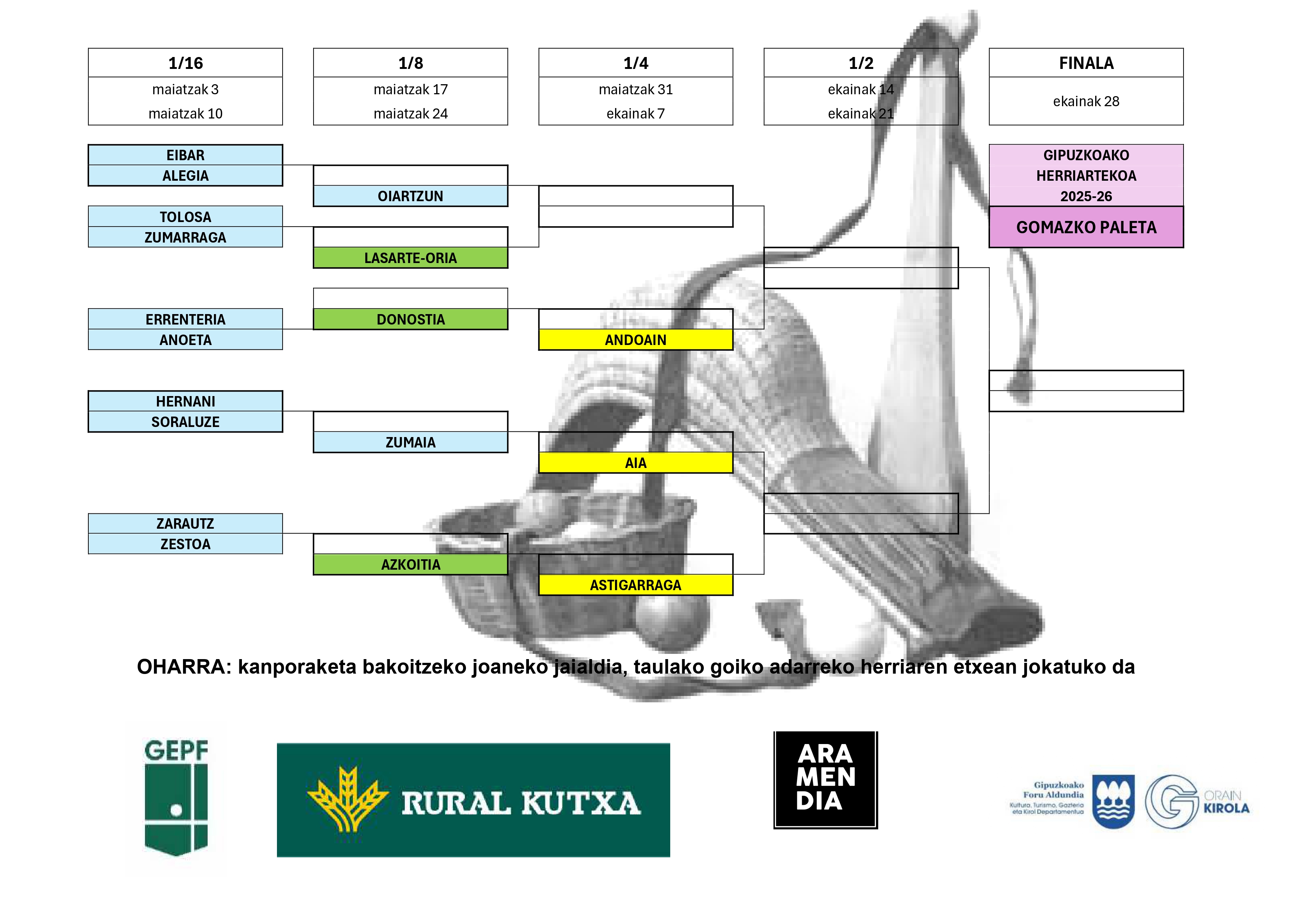 Aiak, Azkoitiak, Azpeitiak eta Zestoak jokatuko dute eskuzko modalitatean. Koadroaren beheko adarrean hasiko dute lehia lehen hiru herriek, eta goiko adarrean, Zestoak. Aiak Zizurkilen aurka jokatuko du final hamaseirenetako kanporaketa; Zizurkilen jokatuko dute joanekoa maiatzeko lehen asteburuan, eta Aian, itzulerakoa, hurrengo astean.
