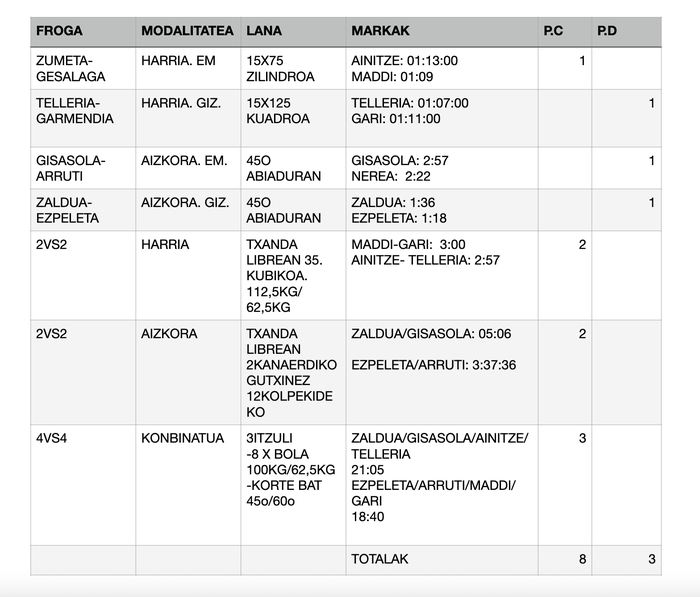 Guztira, zazpi proba jokatu zituzten eta 11 puntu izan ziren jokoan, eta C taldeak 8 puntu bereganatu zituen; D taldeak, berriz, gainerako 3 puntuak. Lehenengo lau probak banakakoak izan ziren, bina aizkoran eta harriarekin, eta horiek puntu bana balio izan zuten. Lau puntutatik hiru erdietsi zituzten D multzokoek, baina bi puntuko ondorengo bi proba konbinatinatuak elkarbatu zituzten. Beraz, azken probara bost eta hiru punturekin iritsi ziren markagailuan.