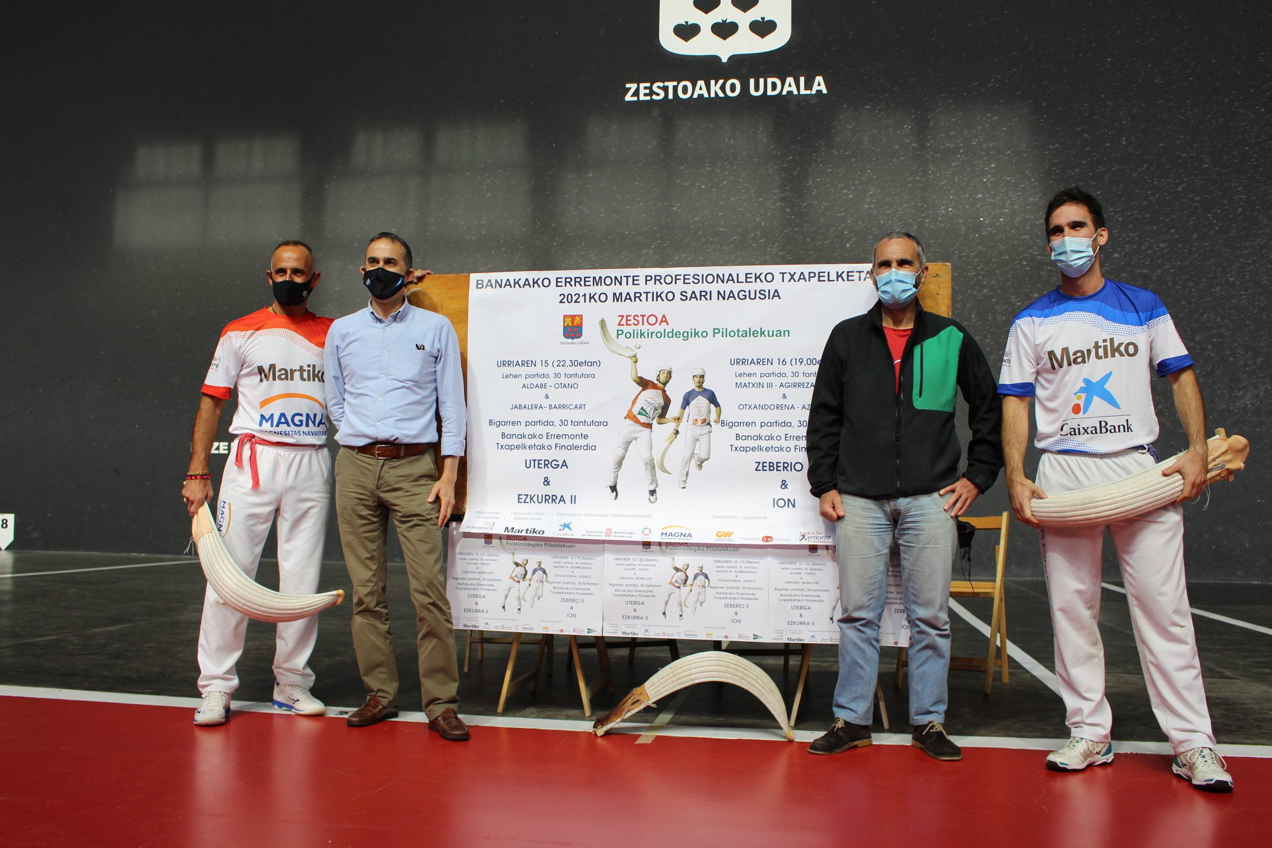 Jose Miguel Leatxe e-Remonte enpresaren ordezkariakk eta bigarren finalaurrekoan ariko diren Ionek eta Zeberiok Mikel Arregi alkateak lagunduta aurkeztu dituzte gaur asteburuko jaialdiak, pilotalekuan bertan.
