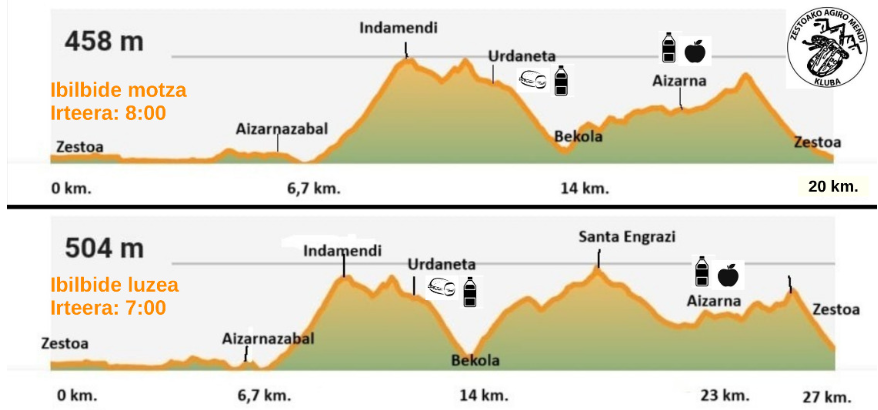 Ibilbide luzeko parte hartzaileak 07:00etan aterako dira Zestoako plazatik; motzekoak, aldiz, 08:00etan. Oinez 27 kilometroko bidea osatuko dutenek Zestoa-Aizarnazabal-Indamendi-Urdaneta-Bekola-Santa Engrazi-Aizarna-Zestoa ibilbidea egingo dute. Ibilbide motzekoak, berriz, ez dira Santa Engrazira igoko, eta Bekolatik zuzenean Aizarnara hartuko dute horiek.