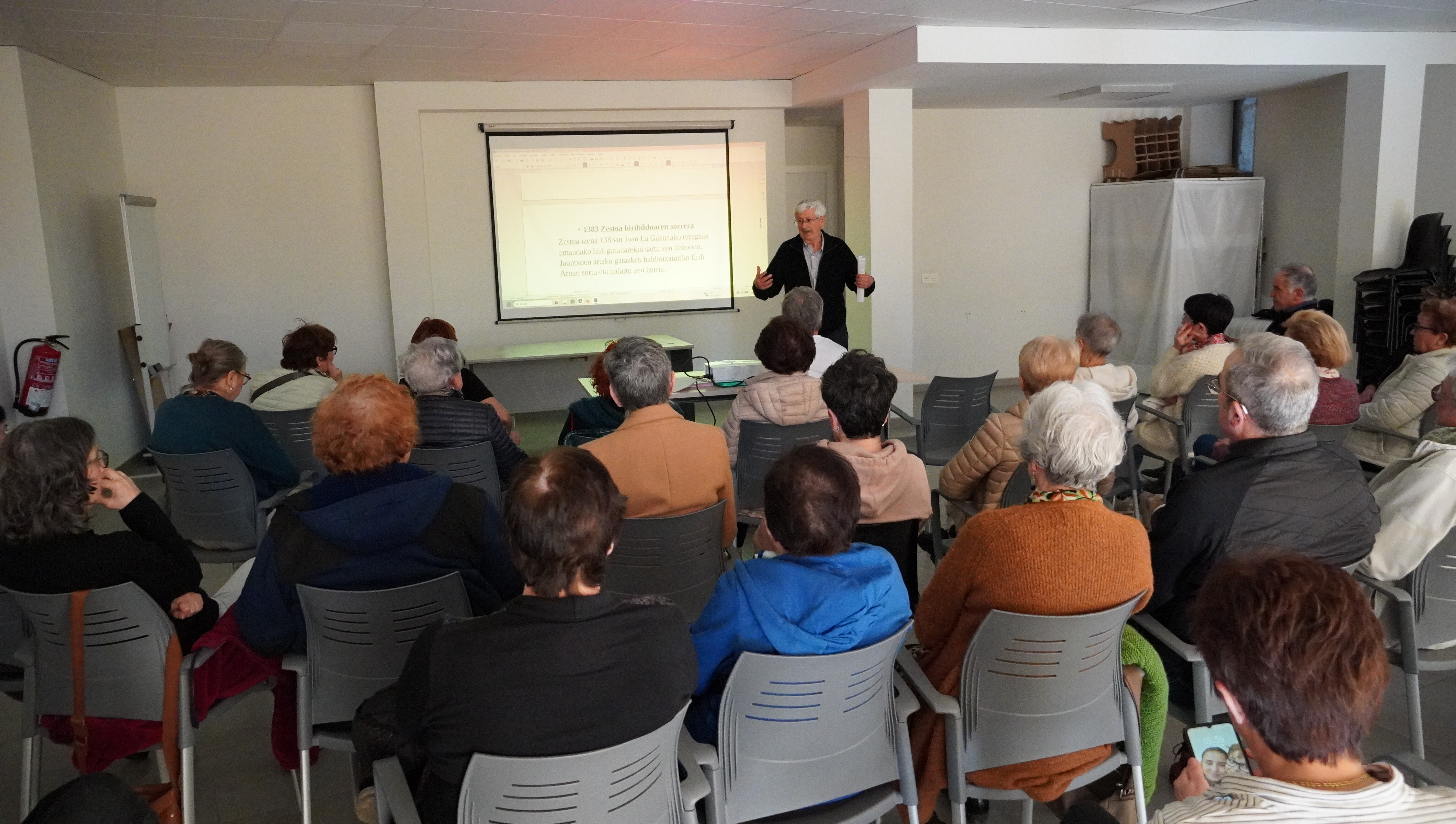 Otsaileko azken astearte epelean, bazkalondoko eguzki printzak jasotzeko kalera edo pasierara irten beharrean, Alonderoko areto ilunduan elkartu dira 30 bat lagun 15:30erako. Ilunduta dago aretoa, hain zuzen, kanpoko eguzki printzak proiektorearen eginbeharrerako oztopo izan ez daitezen. Proiektorea eta hura gidatzen Mikel Irure lagun dituela, herriko historiaren gaineko hainbat kontu aletzen hasteko pronto dago Jexux Odriozola, Zestoa Osasuntsu egitasmoaren barruan antolatu duten Zestoa ezagutuz. Erdi Arora arteko zenbait ohar hitzaldian.