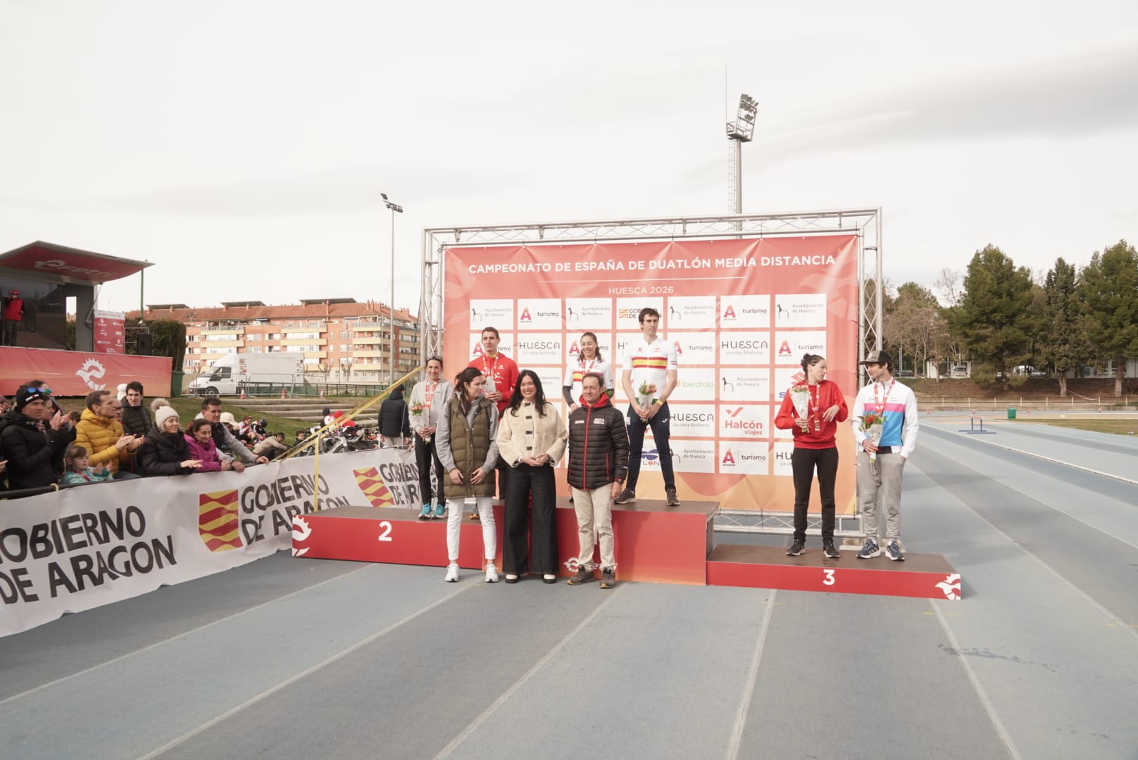Distantzia erdiko Espainiako duatloi txapelketa jokatu zuten atzo Huescan. Duatloia izanik, bi kirol modalitate jokatu behar izan zituzten irteera puntura gerturatu ziren 400 parte hartzaileek, korrika eta txirrindularitza. Lehenbizi, 8,4 kilometro egin zituzten korrika, 60 kilometro bizikletan jarraian, eta, amaitzeko, beste 4,2 kilometro saltaka.